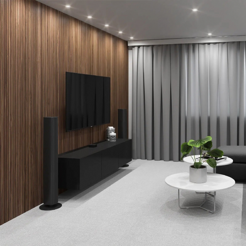 The flexibility of the acoustic panel ThinRibbon is outstanding when it comes to flexibility as the veneer sits directly on the acoustic felt, the thin profile means that it fits perfectly against door and floor moldings without going outside and no extra adaptations when it comes to contacts, switches, etc.