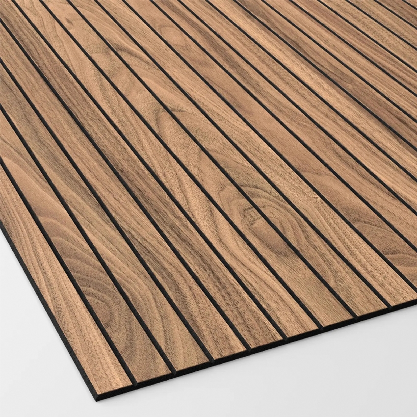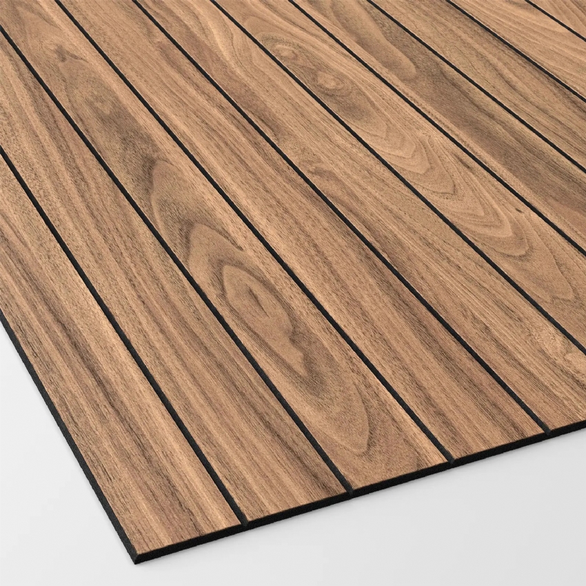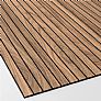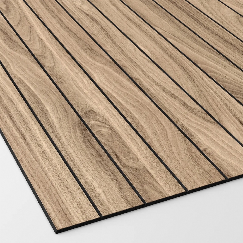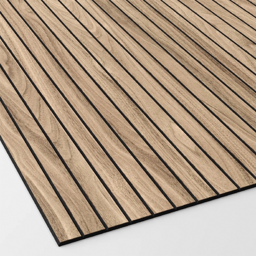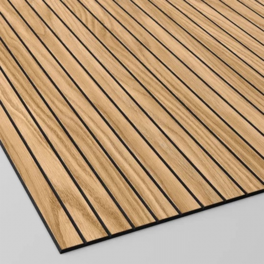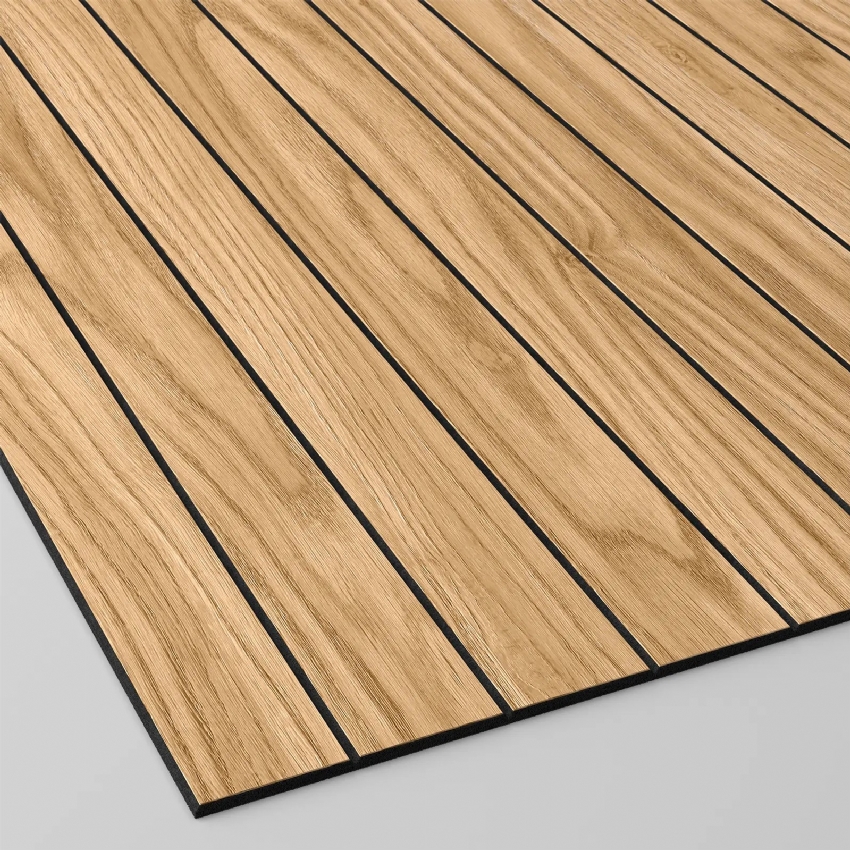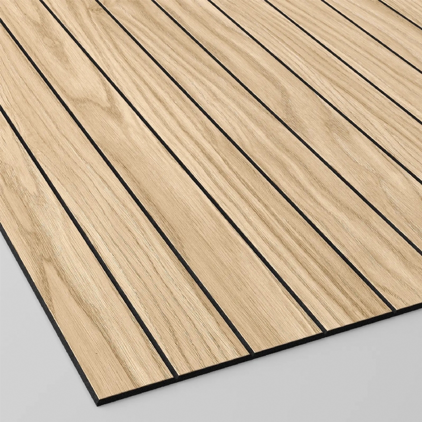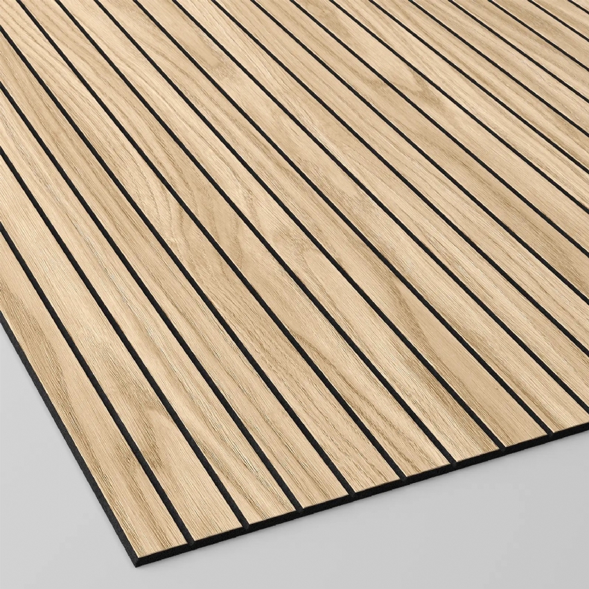 ThinRibbon wooden slat panel with the unique design that you can see the pattern of the wood grain going over one or more slats means that you get a real wood feeling in the room you put the panel in. The pattern of the wood together with the narrow grooves between the wooden slats gives this acoustic panel a harmonious feeling. Our acoustic felt RecoSilent as a base also makes the environment where it is placed quieter. With a low weight of 1.8kg/sqm and only 6mm thick, this wooden slat panel offers many advantages in handling, assembly, transport etc.